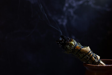 Flat lay various kinds of air element objects to use in witchcraft and wicca on witch's altar filled with sage smudge sticks, incense, Palo Santo tree, frankincense, charcoal disks for smoke cleansing