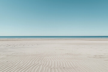 wide camera angle captures deserted sand beach under clear blue sky