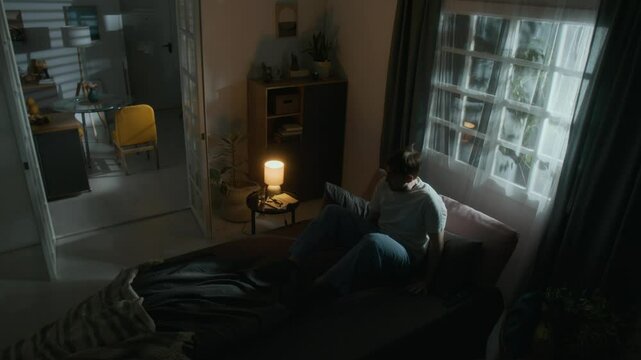 Wide angle shot of man sleeping in bed when doors opening and furniture start moving on its own under flickering light of lamps scaring man by paranormal phenomena in apartment at late night