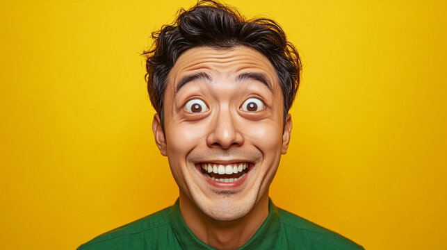 A young man with a beard looks surprised and excited with his eyes wide open while wea casual clothing.