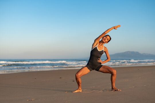 Fit woman practicing a deep side bend yoga pose on the beach at sunrise, standing strong in wide stance with one arm overhead, symbolizing flexibility, discipline, and morning energy.