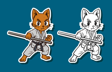 Karate Cat Delivering a Bo Staff Strike in a Wide Stance Cartoon Illustration