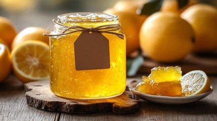 A jar of golden quince marmalade, decorated with a rustic twine bow.