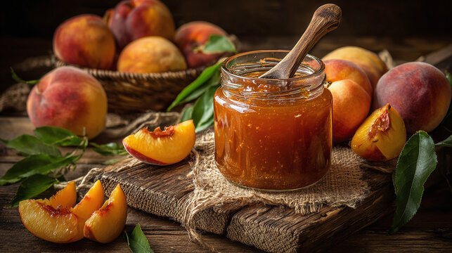 Homemade peach jam in a glass jar, surrounded by fresh peaches and slices. A rustic spoon rests inside the jar, atop a wooden board creating a warm, inviting scene.
