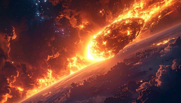 An asteroid impact event causing widespread destruction and fire across the planet's surface, seen from space