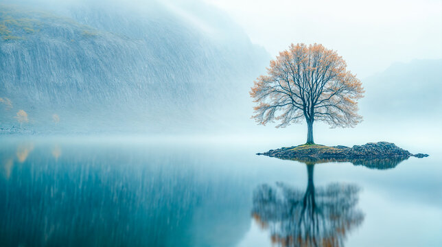 Arbre solitaire aux feuilles jaunes au milieu d'un lac avec de la brume