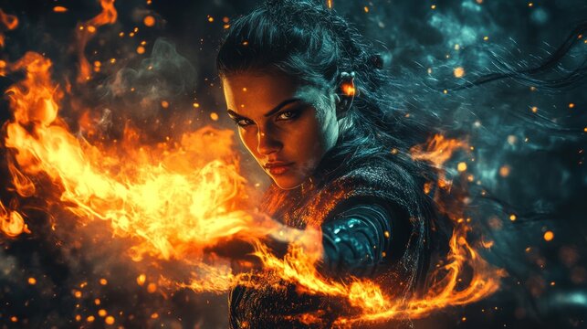 Fierce woman wielding fire, fantasy art.
