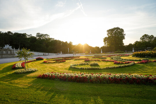 View of golden sunlight bathes the manicured lawns and vibrant flowerbeds in a formal garden, casting long shadows across the landscape, Schönbrunn, Wien, Austria.