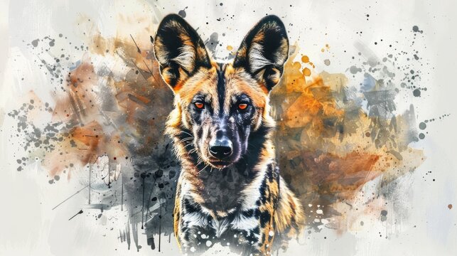 Surreal and captivating image of a wild dog's face with a striking abstract stained backdrop