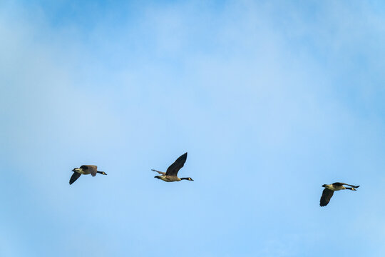 Three geese flying against a blue sky