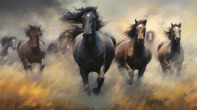 A herd of wild horses gallops across a field of flowers, their manes fluttering in the wind. Generative AI