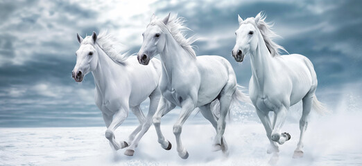 Three white horses gallop through a snowy landscape, their manes flowing in the wind against a dramatic, cloud-filled sky, evoking freedom and power