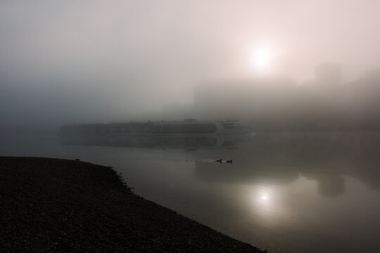 Boat sailing on water between fog