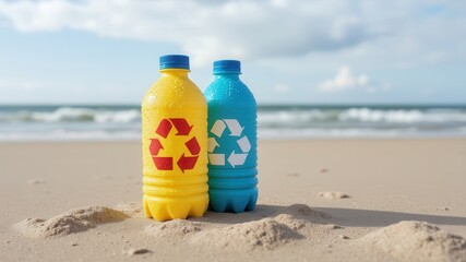 Recycle to save wildlife. Two recycling bottles, one yellow and one blue, sit on a sandy beach, highlighting environmental awareness against a backdrop of the ocean.