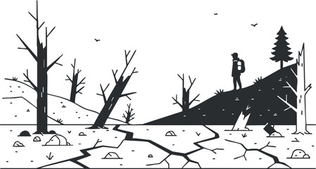 A silhouette of a hiker standing on a barren landscape with dead trees and cracked ground in black and white vector style, suitable for environmental awareness projects