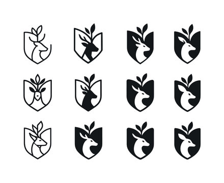 Set of male and female deer silhouettes in various poses on white background, flat vector wildlife illustration for forest, nature, and animal-themed design projects