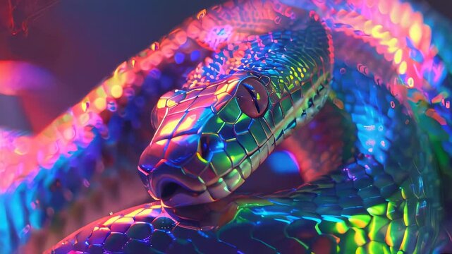 Stunning close-up of snake with iridescent scales under neon lighting, showcasing vibrant, multicolored patterns and intricate textures of its skin. 2025 New Year symbol