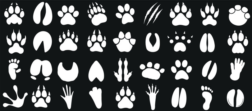 Animal paw print collection, white silhouettes on dark, diverse wildlife tracks, ideal for nature, tracking themes, vector isolated