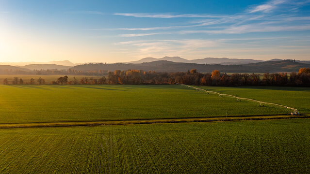 Sprawling Willlamette Valley Grass Seed Field in a Golden Sunset in Fall near Monmouth, Oregon, Pacific Northwest, United States - Aerial Photo