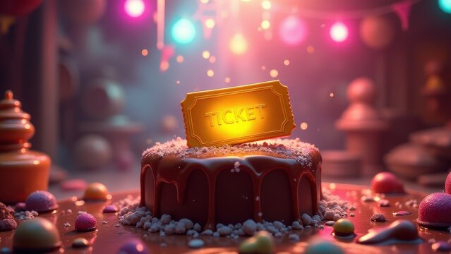 Golden ticket, A glowing golden ticket atop a chocolate fountain under soft multi-colored lights in a bright fantasy setting