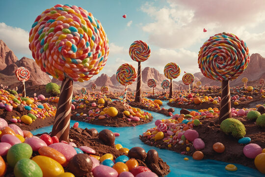 Whimsical Candy Land with Lollipop Trees & Chocolate River - Surreal Dessert Landscape Vector - Playful Sugarscape Illustration - Childhood Dream World - Willy Wonka-Inspired Art