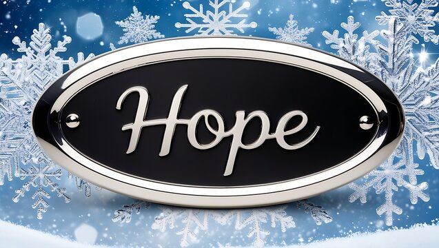 A silver oval sign with the word "Hope" in a cursive font, set against a background of white snowflakes on a blue sky.
