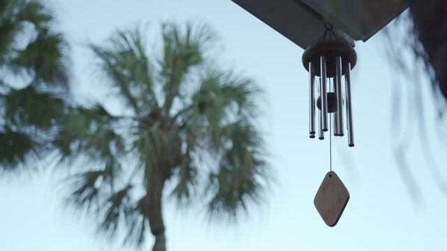 Calming and relaxing view of a wind chime blowing in a tropical garden