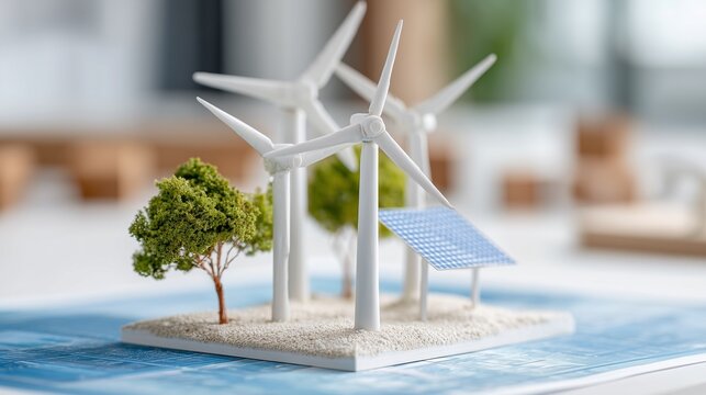 Miniature wind turbines and solar panel on a model landscape. Sustainable energy concept.