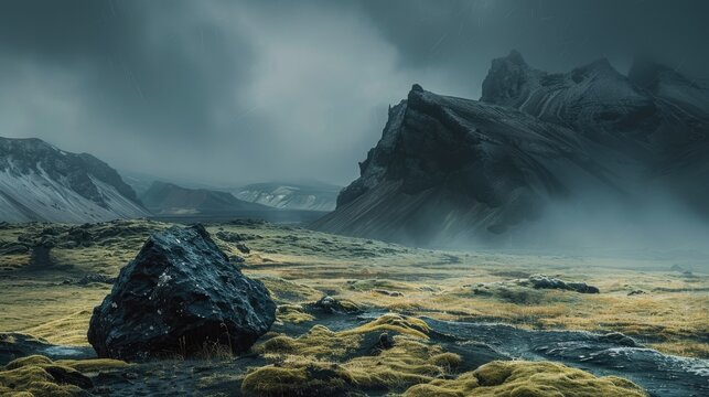 Stormy Icelandic landscape with windbag and dark mountains, concept of creative business ideas and challenges
