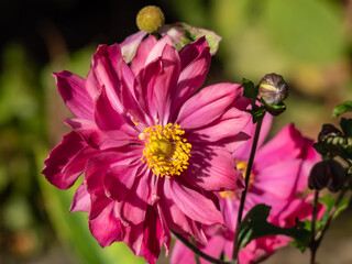 Beautiful and attractive shot of large, semi-double, rose pink flowers with golden-yellow stamens of variety of Japanese Anemone or windflower (Anemone hupehensis 'Prinz Heinrich'