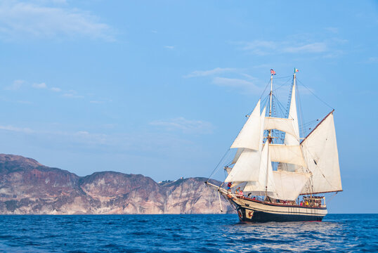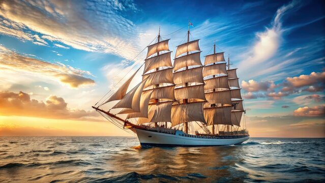 Vintage windjammer style ship with full sails on the open sea