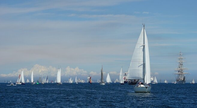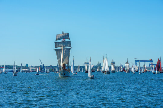 Tall ships passing Kieler Förde to Kiel week. Parade of sailing ships during Kiel Week, Kiel Fjord, Schleswig-Holstein, Germany.