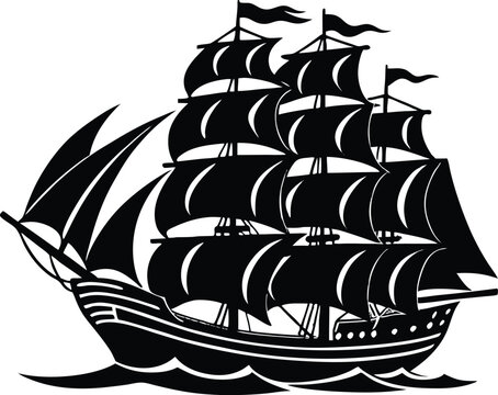 Silhouette of a ThreeMasted Sailing Ship Adrift on the Open Ocean
