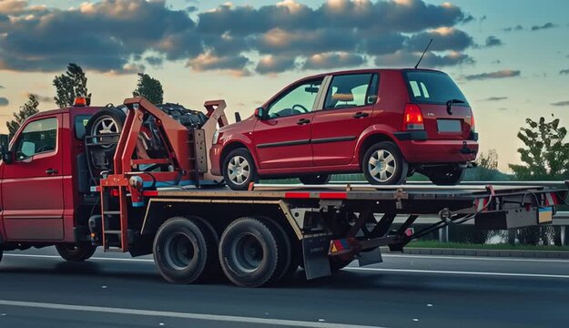 Tow truck with the broken family car on the road. Car service transportation concept. Tow truck transporting the vehicle on a highway
