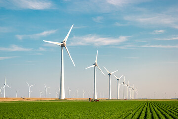 offshore windmill park with stormy clouds and a blue sky, windmill park in the ocean. Netherlands Europe
