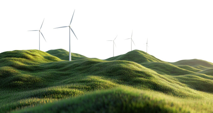 Renewable energy windmills on hilly landscape, isolated on transparent cutout background