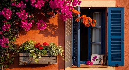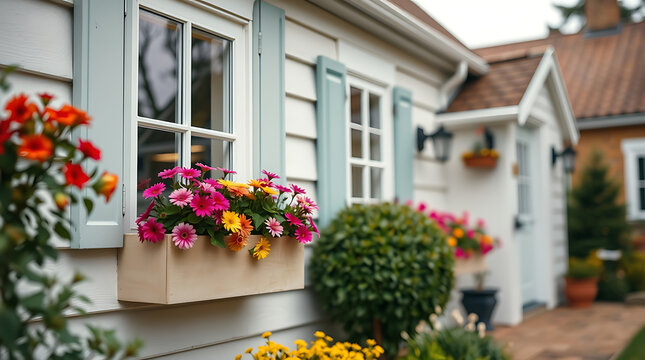 Charming Home Exterior with Colorful Flowers and Window Boxes. Beautiful Architecture and Landscaping. Perfect for Real Estate and Home Decor.