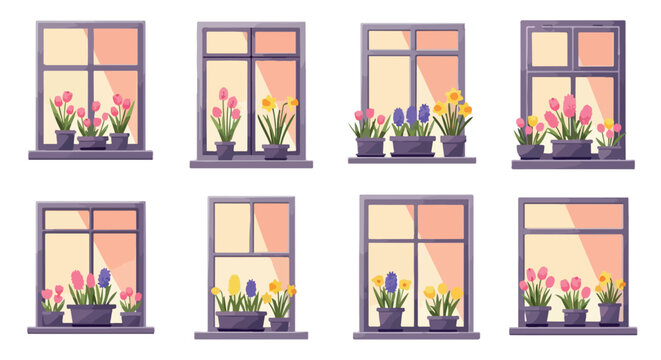 Windowsills with potted flowers springtime scene