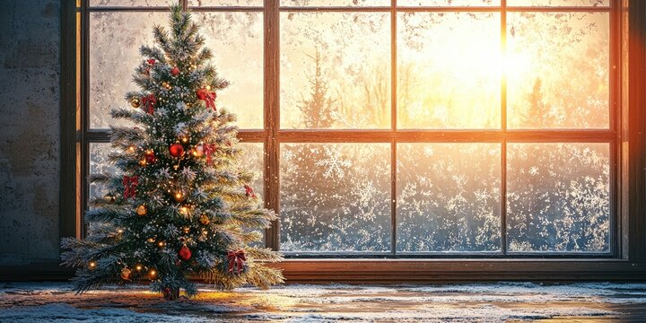 Radiant Christmas tree in front of a frosted windowpane Stock photo