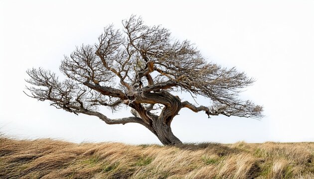 twisting solitude windswept tree bending gracefully rugged branches standing alone on dry grass clear sky backdrop on a white background