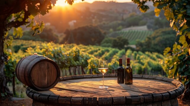 Barrels of wine arranged on grassy hillside at sunset, warm golden tones creating an inviting vineyard atmosphere, concept of wine country tours or winery