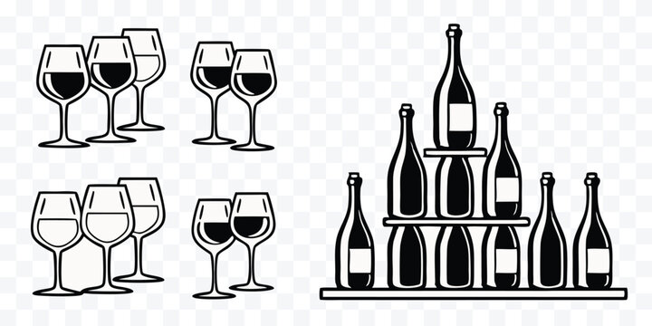Elegant Wine and Champagne Bottles and Glasses Black and White Vector Illustration Celebration Alcohol Drink Design Template Party Background