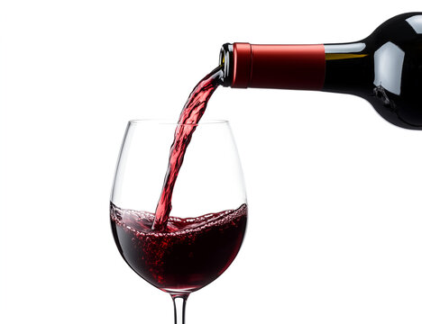Pouring red wine from a glass bottle into an elegant stemware, rich burgundy liquid splashing, close-up backlighting, PNG format isolated on transparent background, fine beverage photography.
