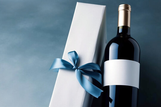 Mockup template, flat lay, with dark glass wine bottle and white gift box with blue ribbon on blue background. Generative AI