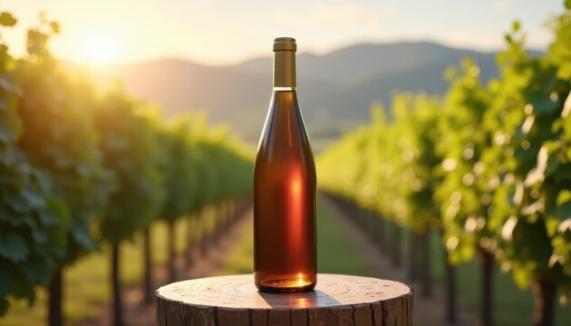 Mockup of a luxury wine bottle neatly placed on a podium on a vineyard background.