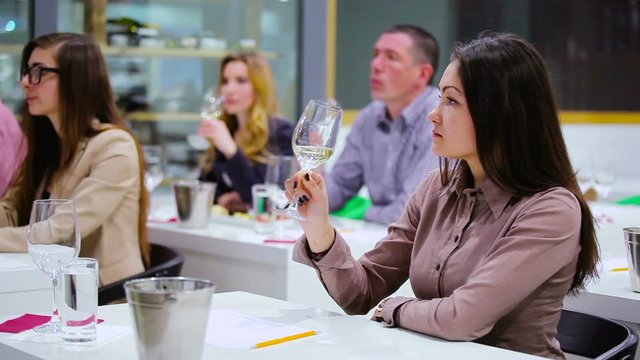 Beautiful woman tasting a white wine on degustation