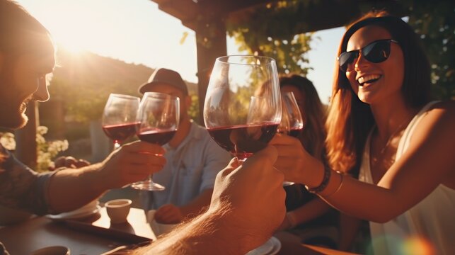 Young Friends Toasting Red Wine Glasses in Countryside Vineyard - Happy Hour Joy at Winery Bar. Group of Young People Celebrating Friendship and Relaxation in Rural Setting