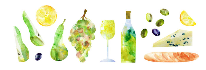 Watercolor wine glasses set. Beautiful glasses for decoration menu in restaurant or cafe. Alcoholic beverage.