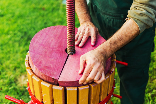 Winepress machine.Young man making wine using wooden winepress machine. Crusher on grass outdoors. Grape harvest. Concept of small craft business. Special equipment for production of wine, winemaking