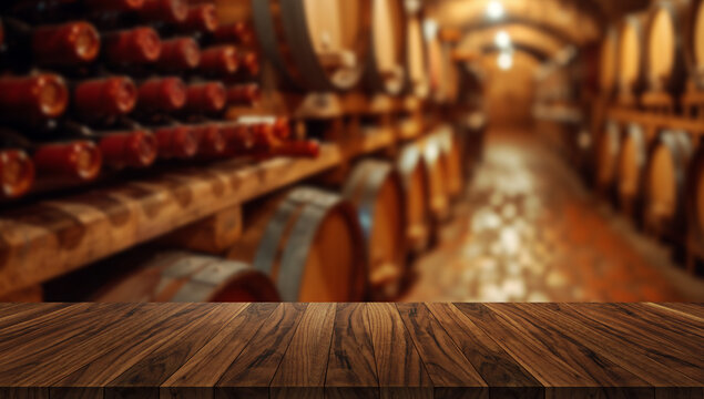 Dark wooden worktop or tabletop with blurred background of a rustic wine cellar full of barrels and bottles. Perfect for wine branding mockups.